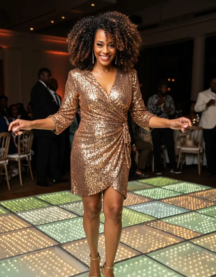 This dazzling party outfit features a bronze sequin wrap dress with a V-neckline, three-quarter sleeves, and a flattering gathered waist that ties at the side. The hem hits just above the knee with a slight asymmetrical edge, perfect for twirling on the dance floor. She finishes the look with gold strappy heels, dangling earrings, and a smile that lights up the entire room.