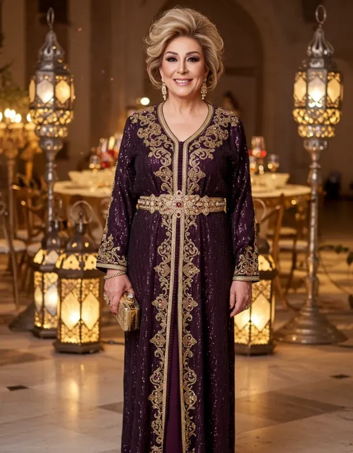 This breathtaking party look features a plum-colored kaftan adorned with intricate gold embroidery and glimmering sequins from top to bottom. The long sleeves and floor-length silhouette offer full coverage while still looking completely luxurious. A wide embellished belt cinches the waist to create shape, and the ornate gold clutch and earrings complete this show-stopping ensemble with perfect harmony.