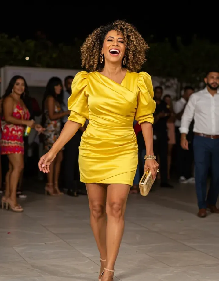 This vibrant party outfit features a bold yellow satin mini dress with structured puff sleeves, a wrapped bodice, and subtle side ruching for a flattering fit. The glossy fabric catches the light beautifully, giving it that extra wow factor. Paired with strappy nude heels, gold statement earrings, and a glittery clutch, this look is pure sunshine in outfit form.