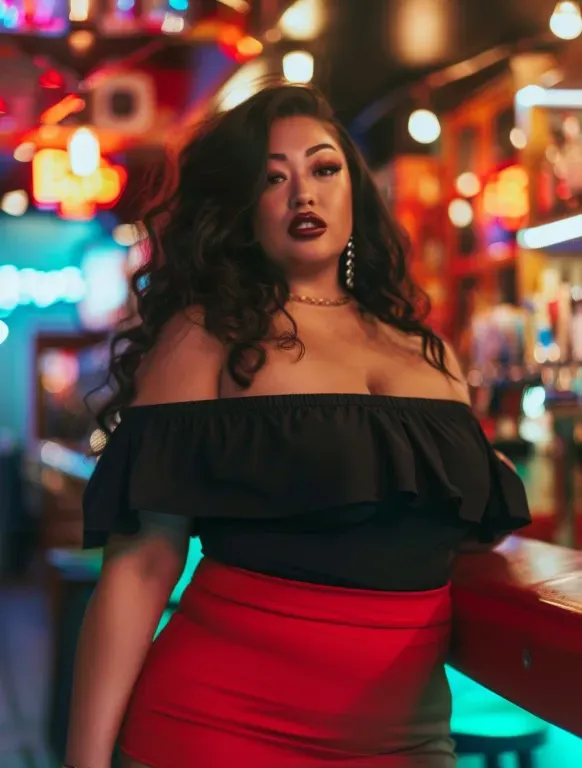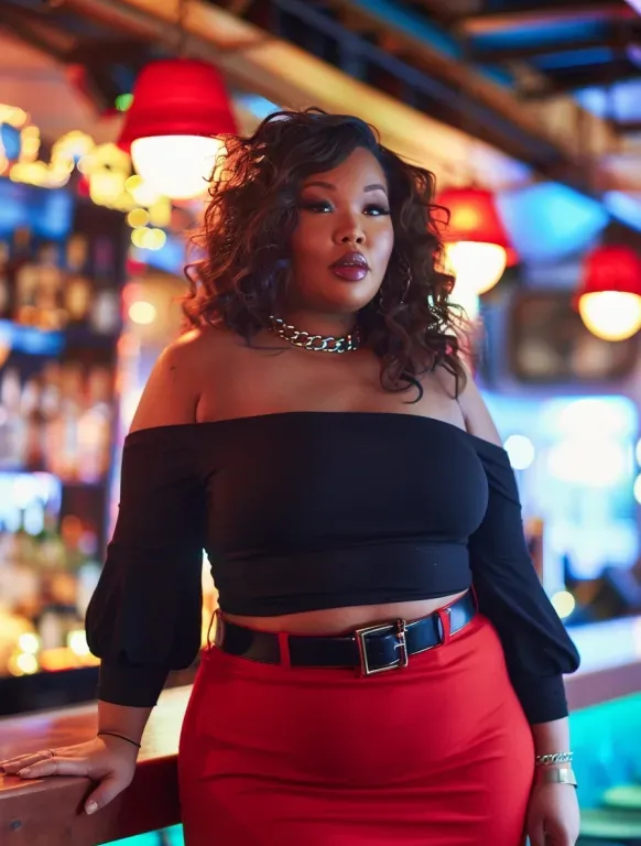This outfit features a bold black off-shoulder top paired with a matching high-waisted black leather skirt. The off-shoulder top highlights the collarbones and adds a hint of allure, while the leather skirt emphasizes the curves beautifully. The ensemble is polished with large hoop earrings and a stunning confident pose. The sleek, black-on-black vibe is sleek, simple, yet powerful, making it perfect for a night out at the bar.