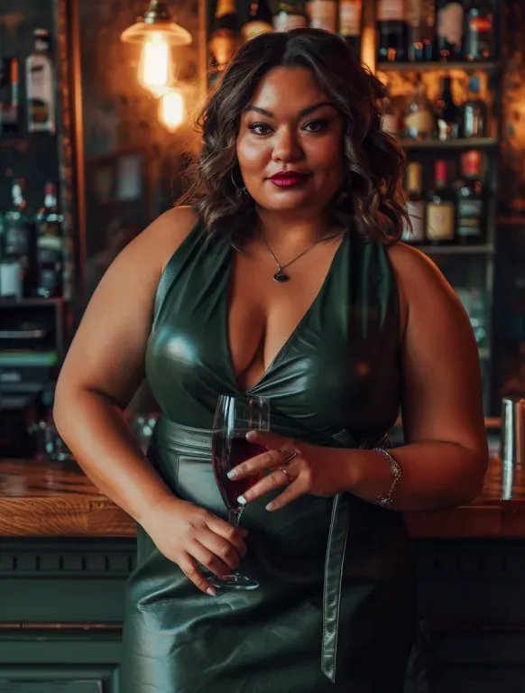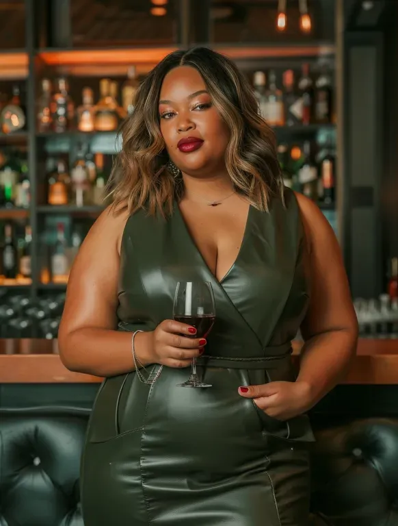 This outfit features a stunning green faux leather dress with a flattering belt that cinches the waist, creating a beautifully defined silhouette. The deep V-neckline adds a touch of sexiness, while the sleek leather fabric gives it an edgy yet sophisticated vibe. With the dress s form-fitting design and the addition of a glass of wine in hand, this look is both daring and chic.