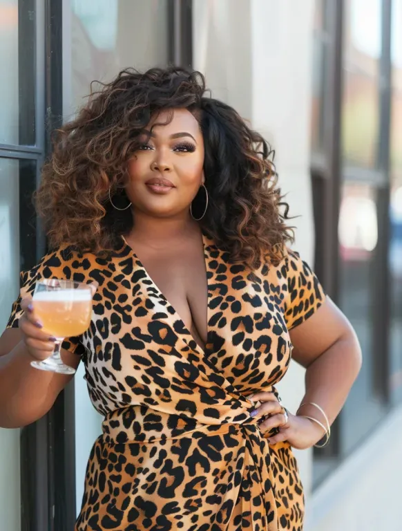 This outfit features a stunning leopard print wrap dress that hugs the body in all the right places. The deep V-neck and short sleeves give it a flirty feel, while the wrap design cinches the waist to enhance curves. The dress finishes just above the knee, offering a perfect balance of flirt and sophistication. Paired with bold hoop earrings and a cocktail in hand, this look is effortlessly chic.