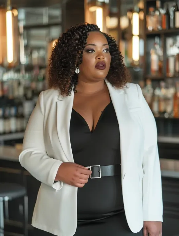 This outfit features a sleek black dress with a flattering V-neckline, paired with a white blazer. The black dress is cinched at the waist with a wide belt, adding shape and definition. The combination of the black dress and white blazer is timeless and chic, with the belt accentuating the waist for a perfect silhouette. The look is elevated with statement earrings and bold makeup, making it a great choice for a fashionable bar night.