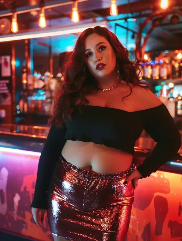 I absolutely love how this outfit strikes the perfect balance between playful and edgy. The off-shoulder top is feminine and fun, while the metallic skirt adds an element of boldness that feels perfect for a night out. This look makes a statement without being over-the-top, and I can totally see myself rocking this for a bar night where I want to turn heads and feel confident. It s a fun and flattering outfit that s perfect for showing off your curves while feeling fabulous!