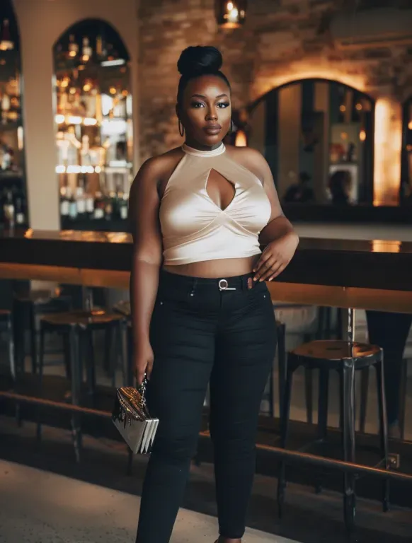 This sleek satin halter top in a soft champagne color pairs beautifully with high-waisted black skinny jeans. The keyhole neckline gives it a chic, flirty vibe while the smooth satin fabric adds a luxurious touch. Paired with a small metallic clutch and strappy heels, this outfit is both minimalistic and stylish, perfect for a night at the bar.