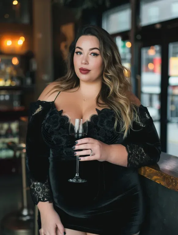 This gorgeous outfit features a black velvet mini dress with delicate lace details on the neckline and sleeves. The luxurious fabric hugs the body beautifully, and the intricate lace adds a romantic, feminine touch. The dress has a flattering fit, skimming over the hips and accentuating curves, while the off-shoulder sleeves add a sensual yet elegant vibe. Paired with a glass of champagne, this outfit is the perfect mix of elegance and allure.