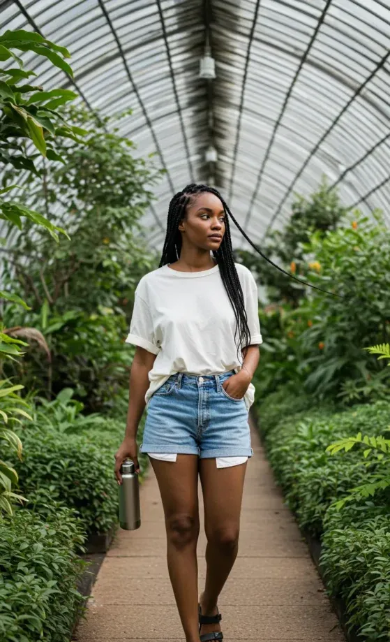 This outfit is all about simplicity and style combined into one easygoing summer look. The model is wearing a classic white t-shirt with rolled sleeves, paired with denim shorts that hit just the right length for a relaxed yet flattering fit. The sandals add a sporty vibe, while the stainless steel water bottle in hand says, “I m ready for an adventure!” The backdrop of lush greenery only adds to the laid-back, nature-inspired aesthetic of this outfit, making it perfect for everything from a walk in the park to a day exploring new spots in the city.