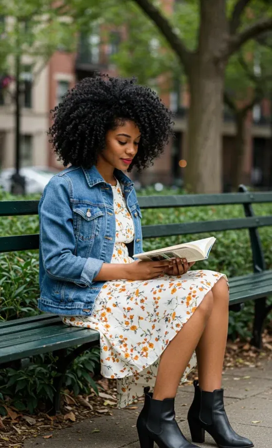 I absolutely love this look it s effortlessly chic! The floral dress feels so fresh and the denim jacket adds just the right amount of structure without overpowering the softness of the dress. The boots elevate the look to something more fashion-forward, and I m all for that contrast between soft and tough elements. This is the perfect outfit for a black woman who wants to stay stylish but also feels completely at ease. Plus, it s versatile enough for a park date or even a quick trip to the coffee shop!