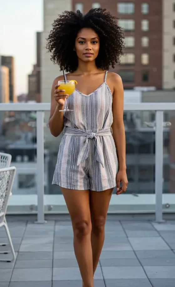 This outfit features a breezy striped romper that s as comfortable as it is stylish. The romper has a relaxed fit with a tie-waist belt, which adds shape while keeping the look laid-back. The light pastel stripes give it a fun, playful vibe, perfect for sunny days. Paired with nude heels, the outfit is effortlessly chic, and the curly hair adds a dose of natural beauty. She s also holding a refreshing drink, adding to the summer-ready vibe of the entire look.