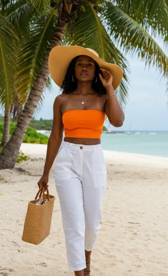 This outfit screams summer fun and carefree vibes! The bright orange strapless crop top is perfect for soaking up the sun, adding a pop of color to the look. Paired with crisp white high-waisted trousers, the outfit is fresh and airy ideal for a day by the beach or a casual lunch by the water. A natural woven tote bag complements the whole look, and the wide-brimmed hat adds a touch of chic sophistication. Simple black sandals tie the outfit together, giving it a laid-back yet fashionable vibe.
