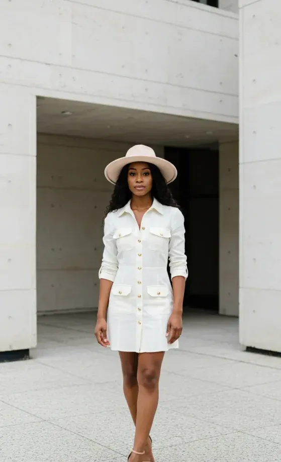 This outfit is a blend of sophistication and effortless style. A cream-colored button-down dress with functional pockets and a belted waist provides a structured yet relaxed look. The gold buttons and the subtle shirt dress design make it perfect for a chic summer day out. Paired with neutral sandals and a wide-brimmed hat, the look is elevated while staying breezy and comfortable. The minimalist backdrop of clean lines in the architecture complements the outfit’s modern and fresh vibe.