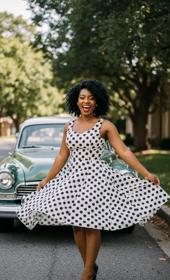 This outfit is pure vintage-inspired perfection. The black and white polka dot dress with a fit-and-flare silhouette is both flattering and fun. The dress features a V-neck and a wide skirt that flows beautifully as you move, creating a playful, feminine vibe. Paired with classic black heels and a bright, radiant smile, this look is perfect for a summer day out or a chic evening event. The backdrop of a vintage car and leafy surroundings adds to the classic charm of this outfit.