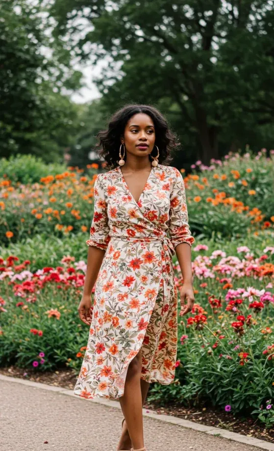 This beautiful outfit features a wrap-style dress with a vibrant floral print, making it perfect for those warm summer days. The dress is adorned with pops of red, orange, and green, set against a soft beige background, creating an eye-catching contrast. The three-quarter sleeves and flowing hemline offer a comfortable and flattering fit, while the tie waist accentuates the figure. Paired with nude strappy sandals, the look is both elegant and effortless, ideal for a stroll through the park or a casual outdoor gathering. The model s natural hair and subtle hoop earrings add a touch of chic simplicity.