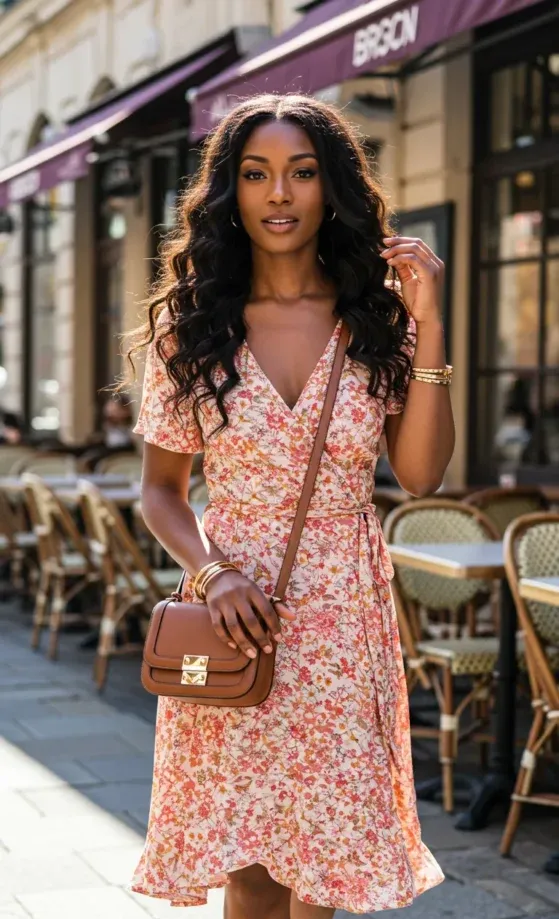 This floral wrap dress is perfect for those who want a blend of femininity and ease. The soft pastel shades of the flowers stand out against the beige background, creating a light and airy feel that is perfect for warm weather. The wrap design creates a flattering silhouette, cinching at the waist with a fabric tie. The dress is paired with a stylish tan handbag and simple gold jewelry, giving it just the right amount of sophistication without being too over-the-top.