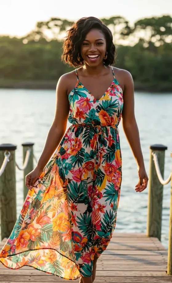 This stunning outfit features a vibrant floral maxi dress, perfect for embracing the summer sun. The dress showcases an eye-catching mix of bold colors fiery reds, oranges, and yellows set against a backdrop of lush greens. The fabric flows beautifully, making it ideal for a day at the beach or a breezy evening stroll. The cinched waist adds shape while keeping things relaxed and comfortable, and the open-toe sandals complete the look with effortless charm. The model s natural curls and radiant smile add that extra touch of carefree beauty, making this outfit as lively as it is stunning.
