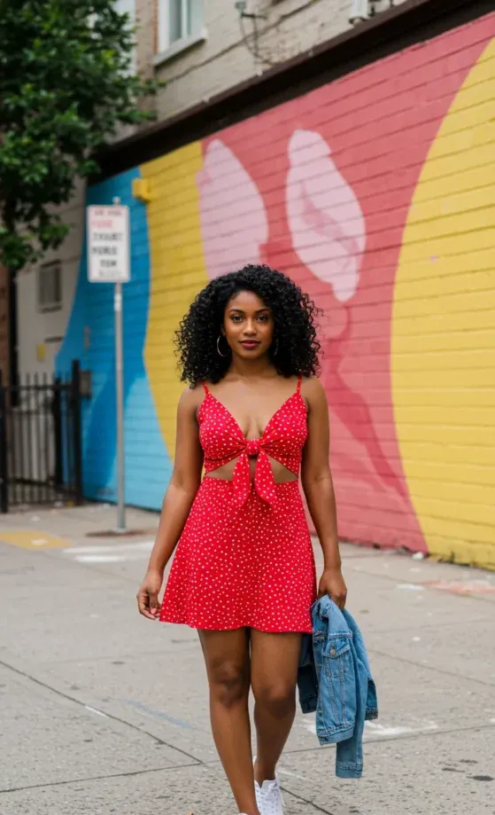 This outfit is a playful and stylish take on a summer classic! The red polka dot mini dress features a flattering tie-front detail and a fun, flirty fit. Paired with fresh white sneakers, this outfit strikes the perfect balance between dressy and laid-back. The denim jacket tied around the waist adds a relaxed touch, while the natural curls and simple accessories keep the look effortlessly chic. The background of vibrant murals complements the bright, cheerful vibe of the outfit, making it an ideal look for a day out in the city or a weekend getaway.