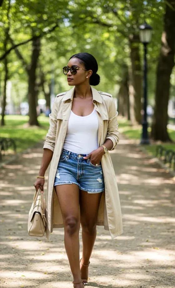 I absolutely love this outfit! The trench coat is a classic, and it works so well with the laid-back vibe of the denim shorts. The neutral tones of the coat paired with the white top give the look a crisp, clean feel, while the shorts add just the right amount of casualness. The accessories sunglasses, sandals, and handbag bring everything together in such a stylish yet effortless way. It s the perfect outfit for a black woman who wants to stay chic and comfortable at the same time!
