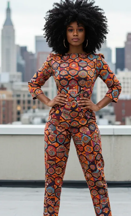 This bold printed jumpsuit is a showstopper! The rich orange, purple, and teal hues of the geometric print are eye-catching and modern, while the fitted style and long sleeves keep it chic and stylish. The jumpsuit’s tailored fit flatters the body, while the simple heels add just the right amount of sophistication. Paired with large gold hoop earrings, this outfit is a perfect balance of trendy and timeless, making it ideal for a night out or a fashion-forward day event.