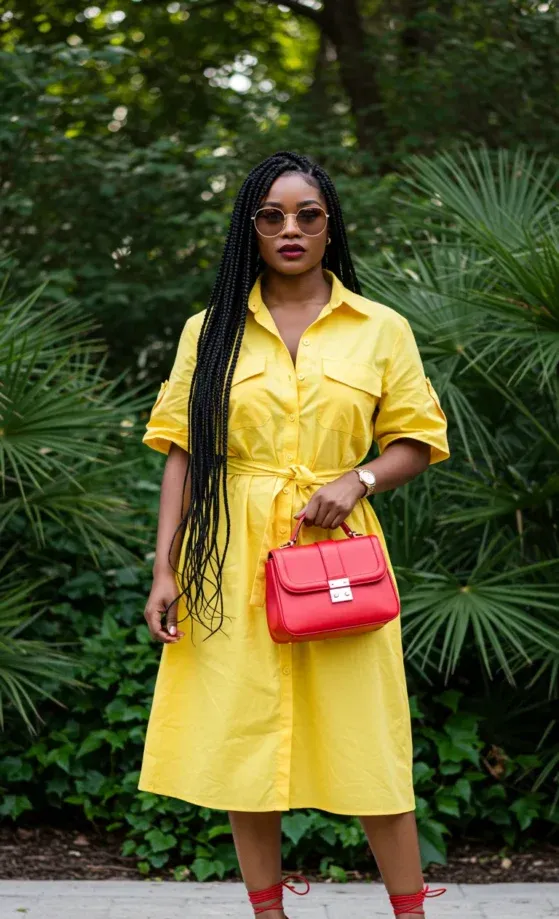 This outfit is all about bold, cheerful energy. A vibrant yellow shirt dress, cinched at the waist with a stylish tie, offers a flattering silhouette and a breezy, comfortable feel. The dress is paired perfectly with a red handbag and matching red strappy sandals, which add a pop of contrast. To complete the look, oversized sunglasses make this outfit the perfect combination of fun and functional. The backdrop of lush greenery highlights the brightness of the ensemble, making it a go-to look for a summer day out.