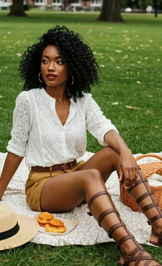 This outfit is perfect for a laid-back yet stylish summer day. A delicate white lace blouse pairs beautifully with tan shorts, creating a balanced look of lightness and warmth. The standout feature, though, is the gladiator sandals, which bring a bold and trendy edge to the outfit. The look is accessorized with a brown belt, large hoop earrings, and a stylish straw hat, making it perfect for a picnic in the park or a leisurely walk. The outfit is completed with a cozy vibe, sitting on a picnic blanket, surrounded by delicious pastries, offering a full picture of a perfect sunny afternoon.