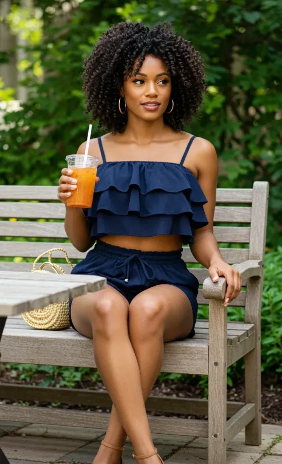 This outfit is giving major summer relaxation vibes with a fun and flirty twist. The navy ruffle crop top, with its playful layers, is paired perfectly with matching high-waisted shorts that have an elastic waistband for ultimate comfort. A woven handbag and nude heeled sandals complete the look, adding a touch of sophistication while staying effortlessly casual. The soft curls and minimal accessories enhance the laid-back vibe, making this outfit ideal for a sunny day out or a casual brunch.