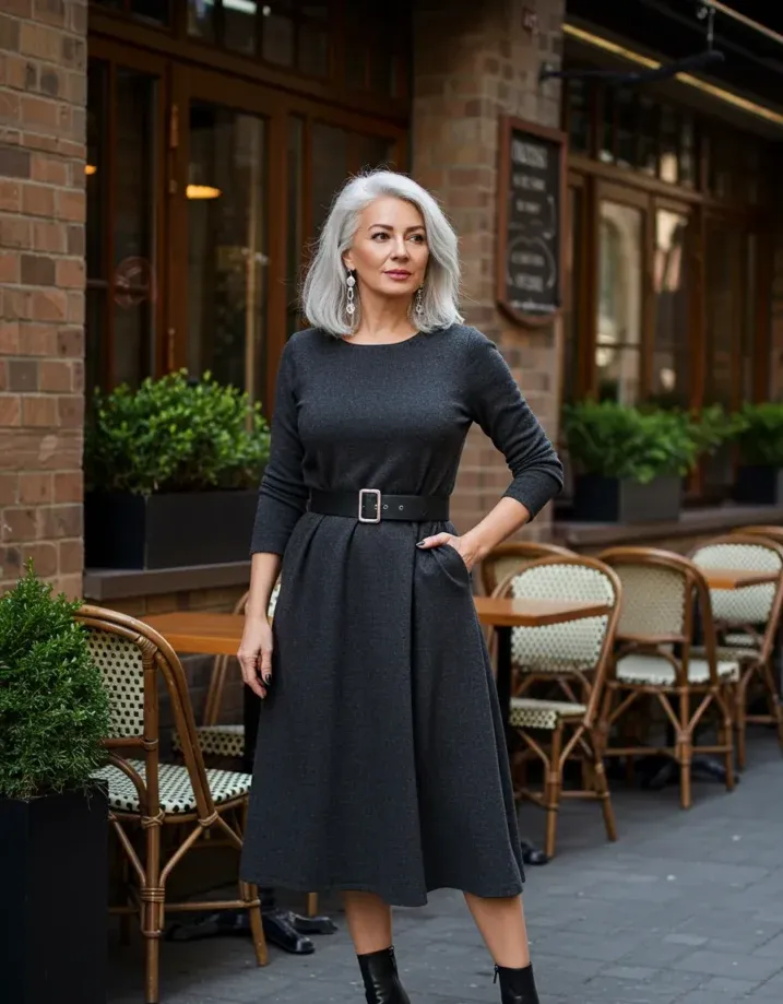 Charcoal Fit-and-Flare Dress with Belt and Ankle Boots