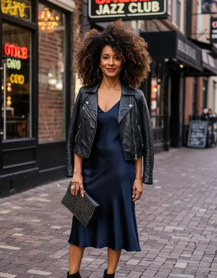I love how this outfit doesn t play by the rules. It s feminine but tough, bold but super wearable. The leather jacket adds that I m confident and I know it” energy, and the satin dress brings just enough softness to balance it all out. This is exactly what I d wear for a date night at a jazz club or any spot where you want to feel like the coolest woman in the room.