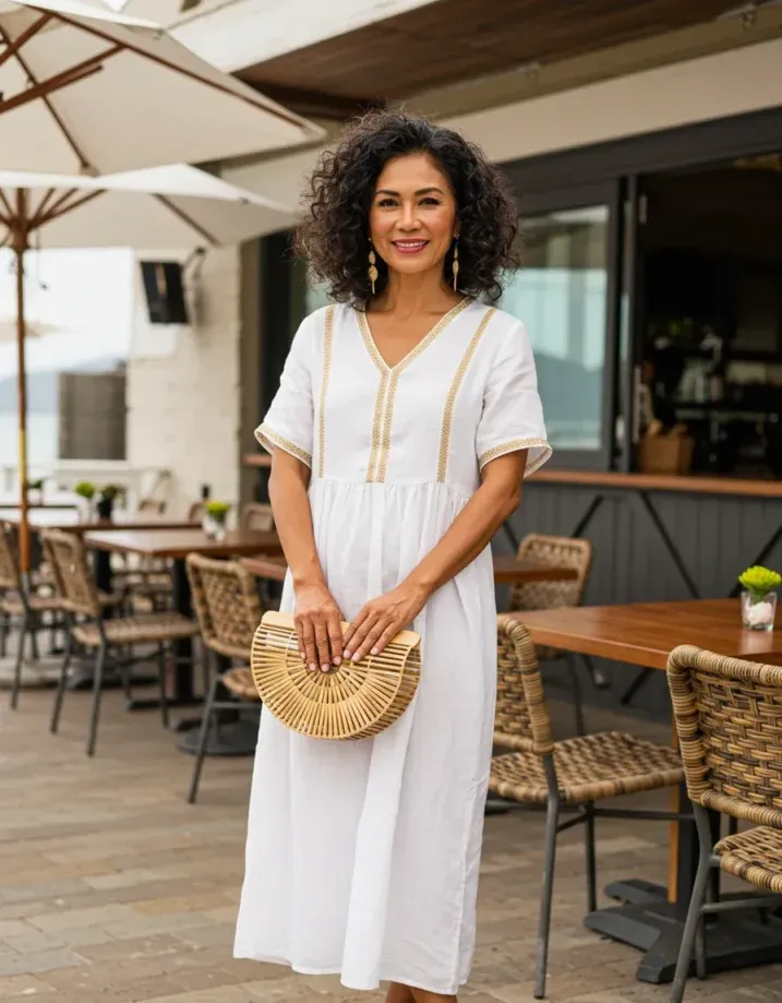 This crisp white dress is the picture of relaxed elegance. It features subtle gold trim along the neckline and sleeves that adds just the right touch of shimmer without going overboard. The flowy silhouette keeps it light and airy, while the golden earrings, woven clutch, and flat sandals round things out with earthy, coastal charm. It s effortless but still totally polished.