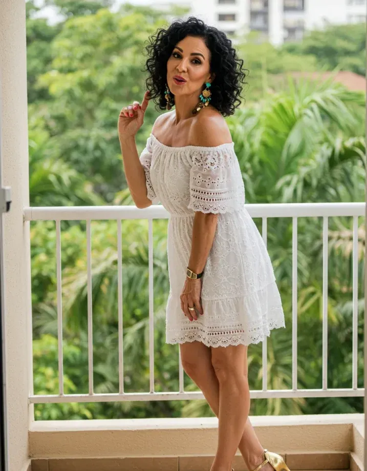 I adore how playful yet elegant this outfit feels. It s breezy enough for warm evenings but still makes a statement. The gold heels and earrings bring a little sparkle, and the off-the-shoulder cut is just the right amount of flirty. Honestly, it s perfect for date nights with a tropical view or spontaneous dancing under the stars. It s cute, confident, and totally fabulous.