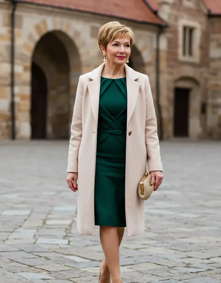 Emerald Green Dress with Cream Coat and Classic Accessories