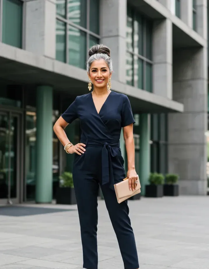 This navy wrap-style jumpsuit is the kind of piece that makes getting dressed feel like a power move. The V-neckline and short sleeves keep it breezy and flattering, while the self-tie belt cinches everything in just right. It s polished yet comfy, and those tapered legs pair perfectly with nude heels. The gold drop earrings and bangles add a little sparkle, and the nude clutch ties it all together like a dream.