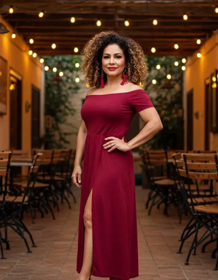What I love most about this outfit is how confident it feels. The color is rich and elegant, the cut is flattering without being too clingy, and that slit is such a fun little touch. It s one of those dresses that makes you feel like twirling under string lights with a glass of red in hand. It s flirty, feminine, and feels like a celebration of you.