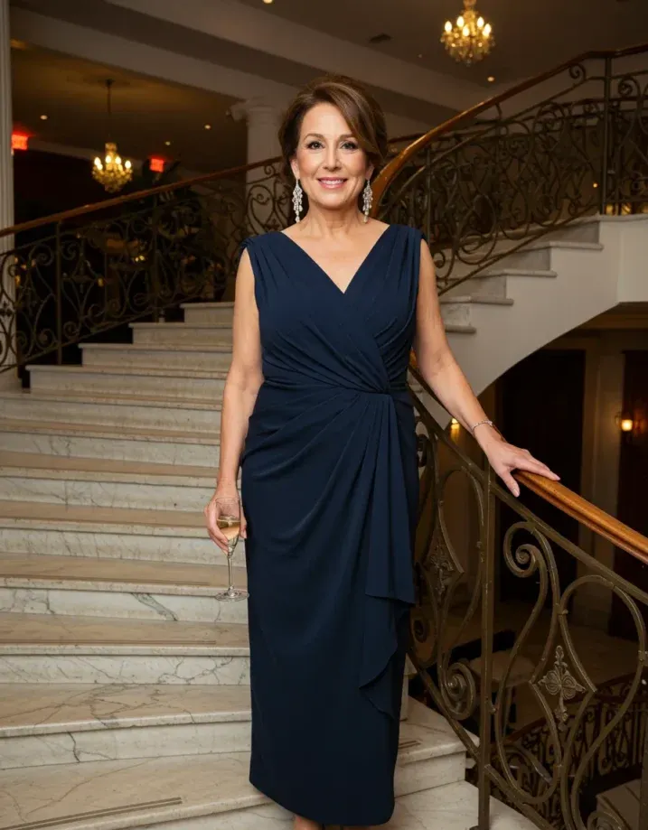 This navy evening gown is pure elegance from head to toe. With its gathered waistline and draped detailing, it flatters the figure beautifully without being too clingy. The deep V-neck adds just the right amount of glam, while sparkling chandelier earrings and silver heels bring the perfect touch of dazzle. It s classic, refined, and totally red-carpet ready.