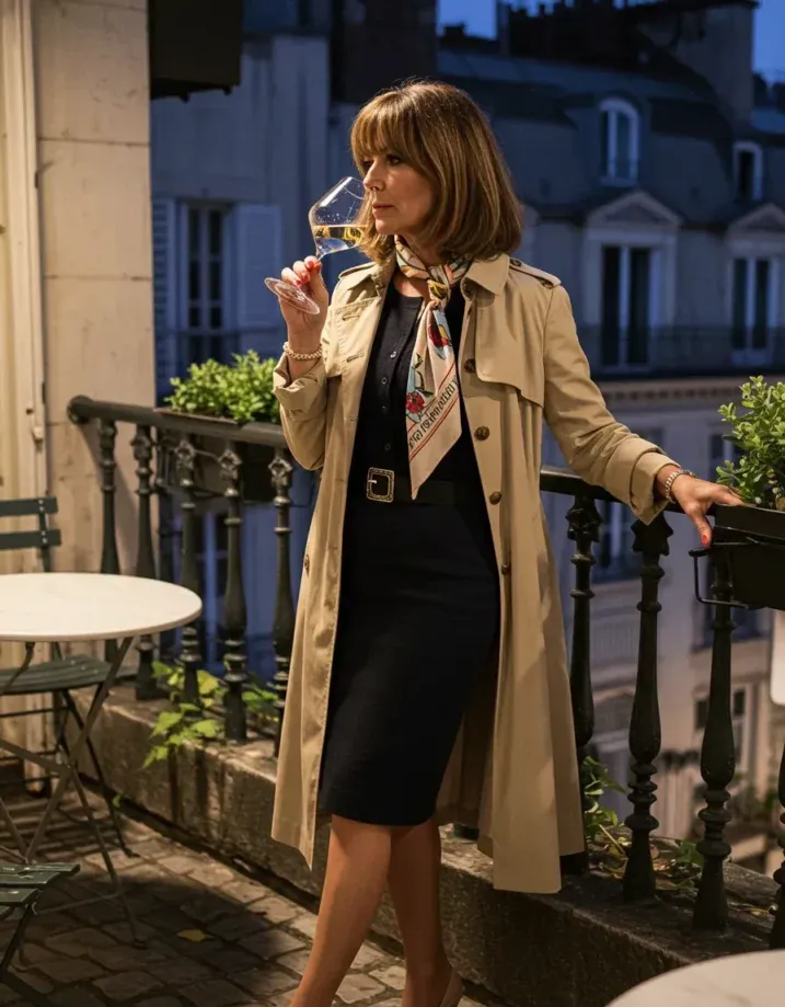 This look is pure timeless sophistication. The tailored navy dress creates a sleek foundation, cinched at the waist with a belt for a refined silhouette. Layered with a classic beige trench coat and finished with a patterned silk scarf tied just right at the neck, it gives off that effortlessly chic French vibe. Neutral heels and delicate jewelry polish it all off perfectly.