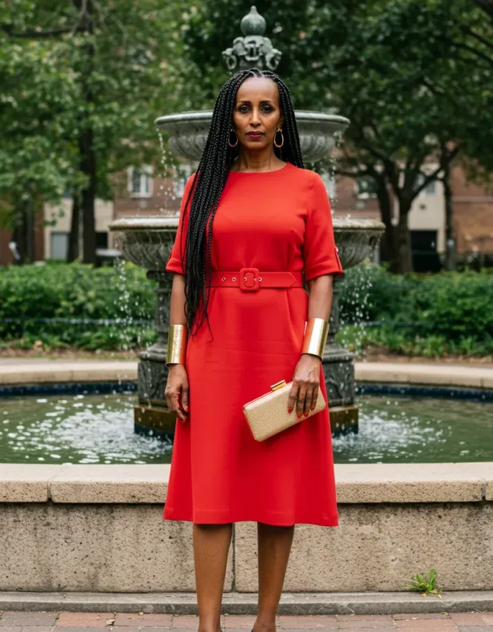 This striking red midi dress is all about bold elegance. The structured fit and mid-length cut give it a graceful shape, while the matching belt pulls everything together at the waist. The gold clutch and wide gold cuffs add just the right touch of drama, and sleek black heels keep things grounded and powerful. It s simple, but in the most commanding way.