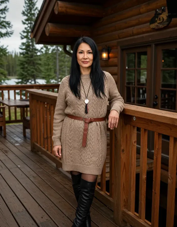 This outfit is the ultimate mix of warmth and style. The tan cable-knit sweater dress feels soft and comfy, and it s belted at the waist to give it a flattering shape. Paired with sleek black over-the-knee boots and a long pendant necklace, the whole look feels rustic-chic and totally ready for a night in the woods or at least dinner by a crackling fire.