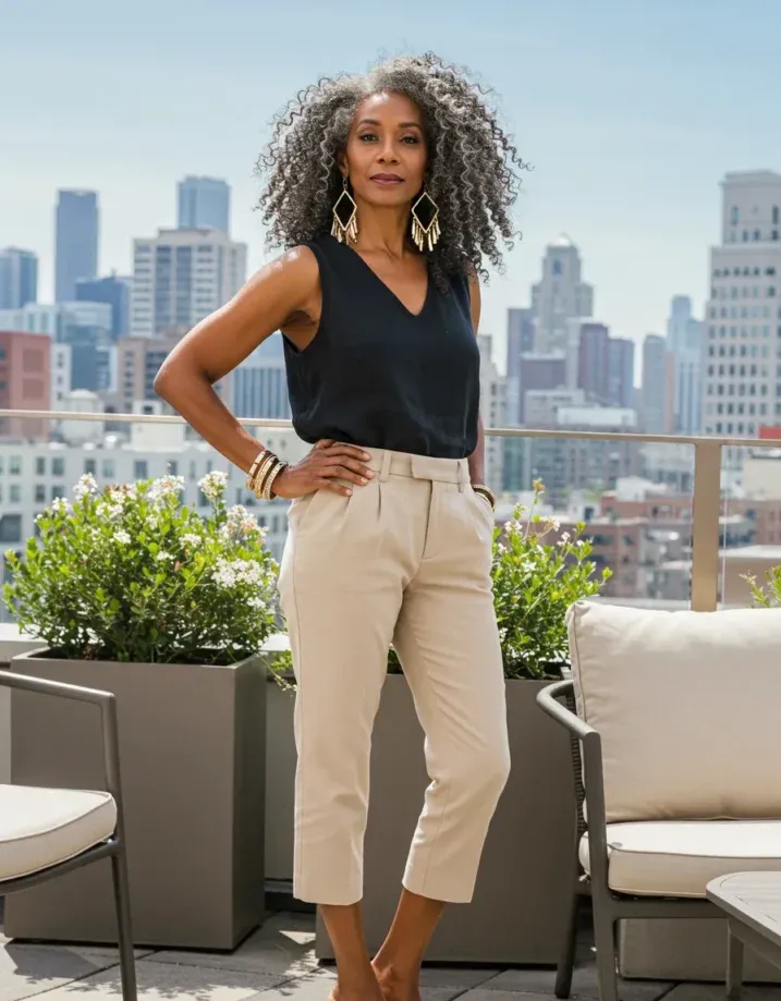 Black Sleeveless Top and Tan Cropped Trousers for Bold City Style