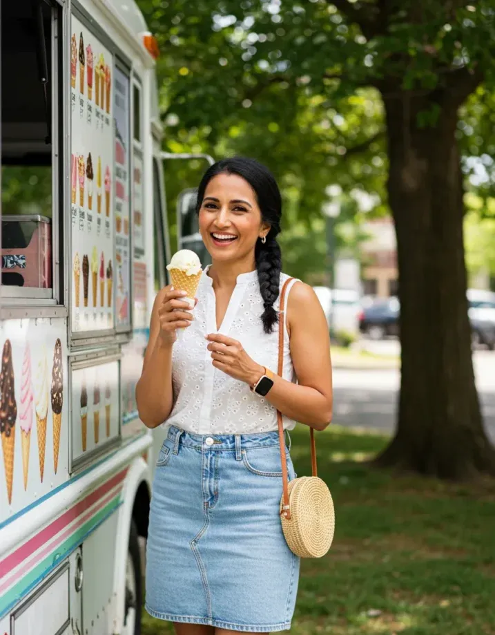 What I love most about this look is how nostalgic and fun it feels. It s a little bit retro, a little bit chic, and totally wearable. The denim skirt is a warm-weather favorite for a reason, and pairing it with eyelet just makes everything feel extra summery. If I had to pick a perfect outfit for chasing down the ice cream truck or wandering through a sunny park, this would be it.