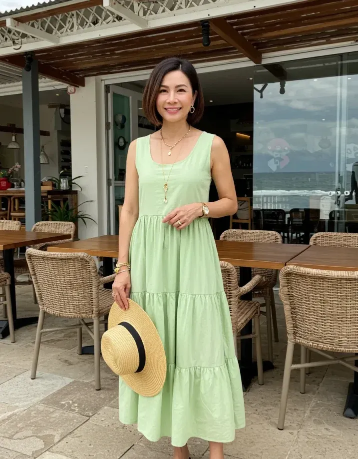 I love how unfussy this outfit is, yet it still makes a statement. It s the kind of dress that makes you feel instantly put together the second you slip it on. The tiers add that bit of movement and swing, and the color is just so cheerful without being too loud. This is the look I d wear for a seaside lunch or just soaking in the sunshine with a coconut drink in hand.