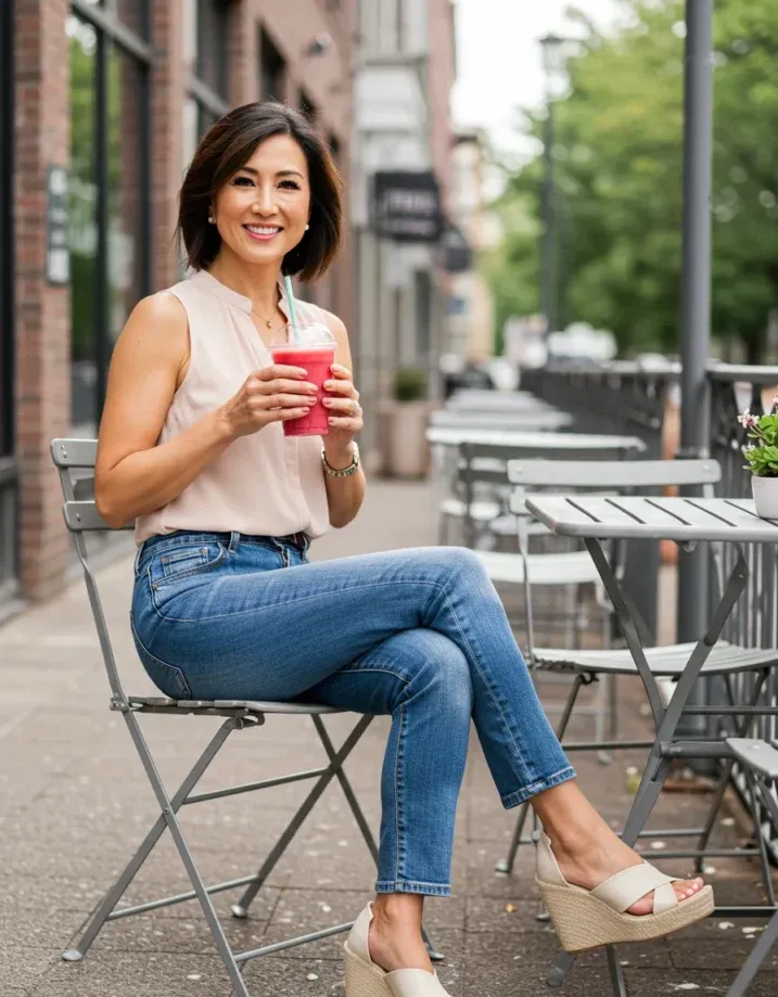 This outfit is a total go-to for casual days when you still want to look polished. The sleeveless blush blouse has a soft, flowy vibe with a clean neckline and no-fuss elegance. It s tucked into a pair of mid-wash skinny jeans that hug just right, and she s wearing it with beige espadrille wedges that add height without hurting your feet. The whole look feels fresh, modern, and absolutely effortless.