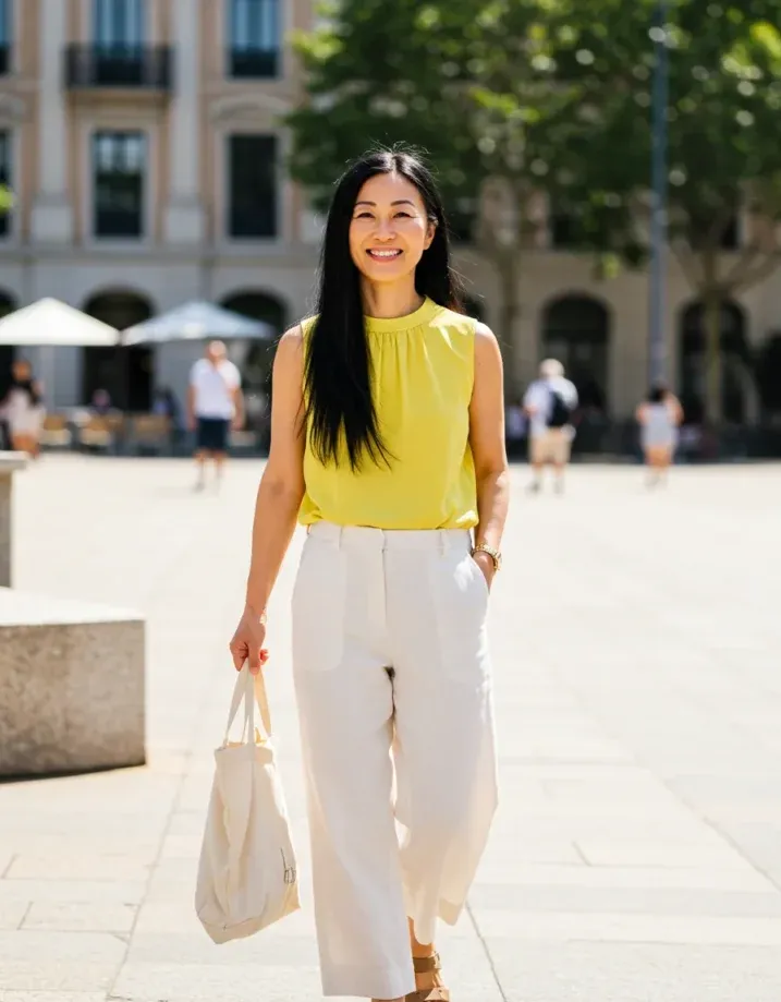 This outfit is pure sunshine in motion. The sleeveless yellow blouse is bright and cheerful with soft gathers around the neckline that add a feminine touch. It s tucked into high-waisted white linen trousers that are breezy, wide-legged, and totally summer-approved. She s styled the look with tan sandals and a simple cream tote, letting the color do the talking while staying completely comfortable and chic.