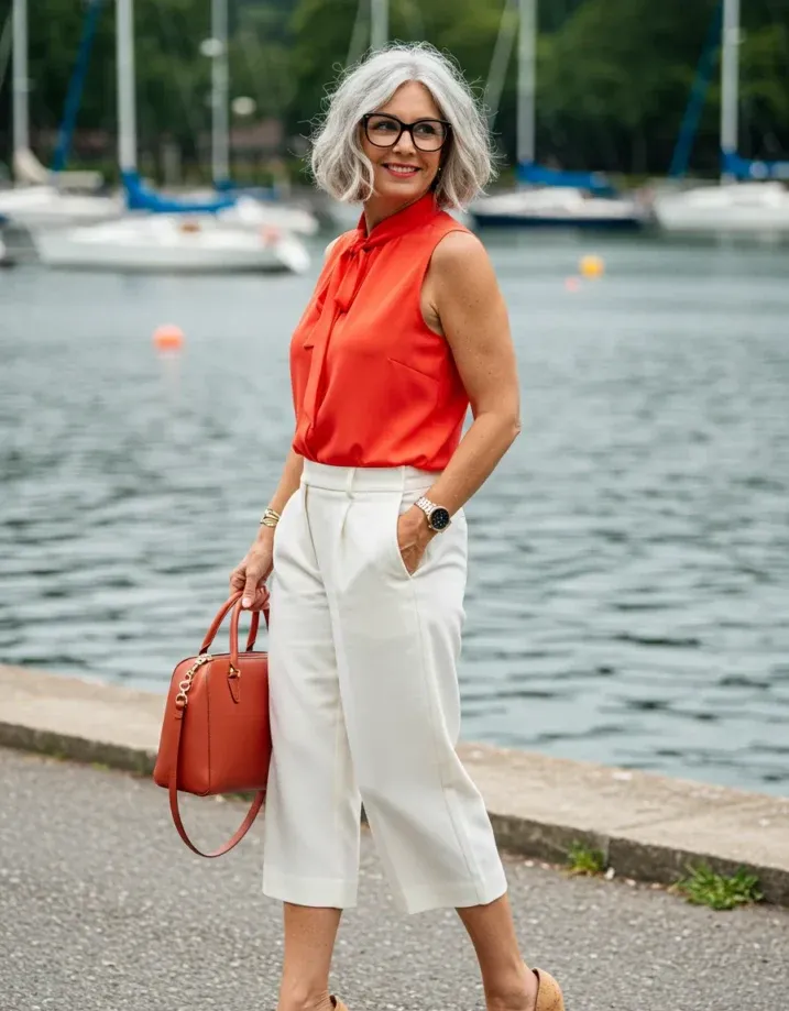 Bold Red Blouse and White Culottes for Nautical Elegance