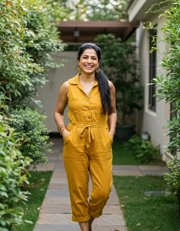 This mustard yellow jumpsuit is the kind of outfit that makes getting dressed a total breeze. It features a collared neckline, front buttons, roomy pockets, and a drawstring waist that adds shape without being fussy. The cropped legs are casually rolled up and paired with simple brown sandals, giving it that easygoing vibe we all love when the sun s out. Gold hoop earrings and stacked bangles complete the relaxed yet intentional look.