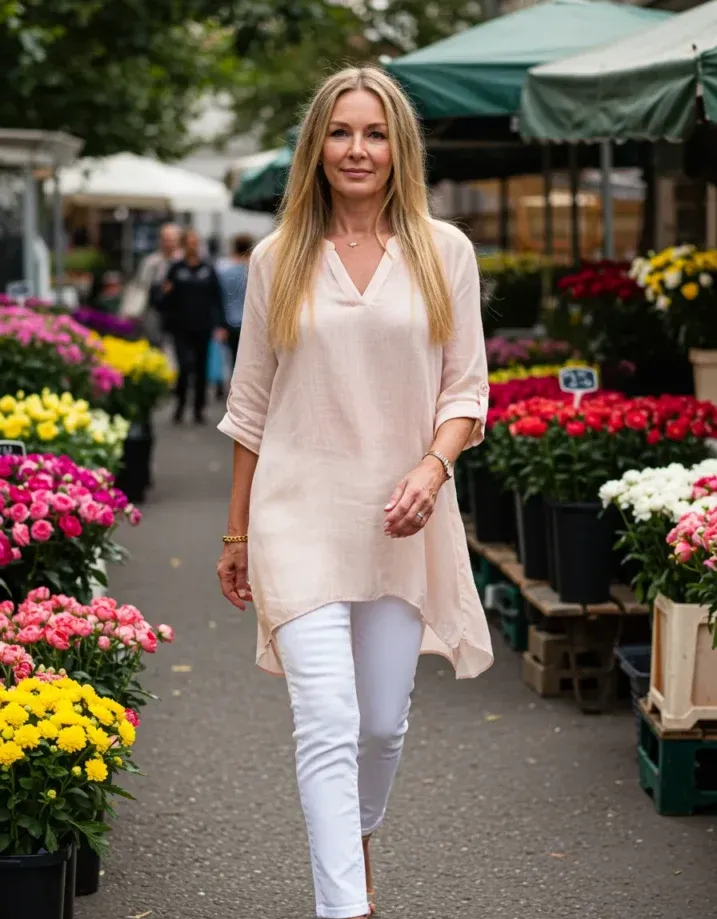 I love how this look says put togetherâ without being the least bit fussy. The tunic is flattering without clinging, and the blush tone is so flattering on sun-kissed skin. It s the kind of outfit that makes you feel like you re glowing even if you just popped out for some fresh peonies and an iced almond latte. Honestly, it s dreamy and doable which is my favorite combination.