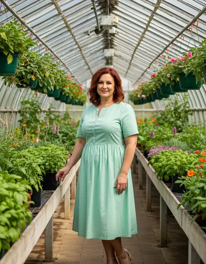 This look is soft, simple, and just plain lovely. The mint green midi dress features a buttoned bodice, short sleeves, and a gentle gathered waist that flatters without clinging. The length hits right at the shin, making it perfect for sandals or wedges like the tan pair she s wearing. The whole vibe is fresh and feminine, especially surrounded by all that lush greenery.