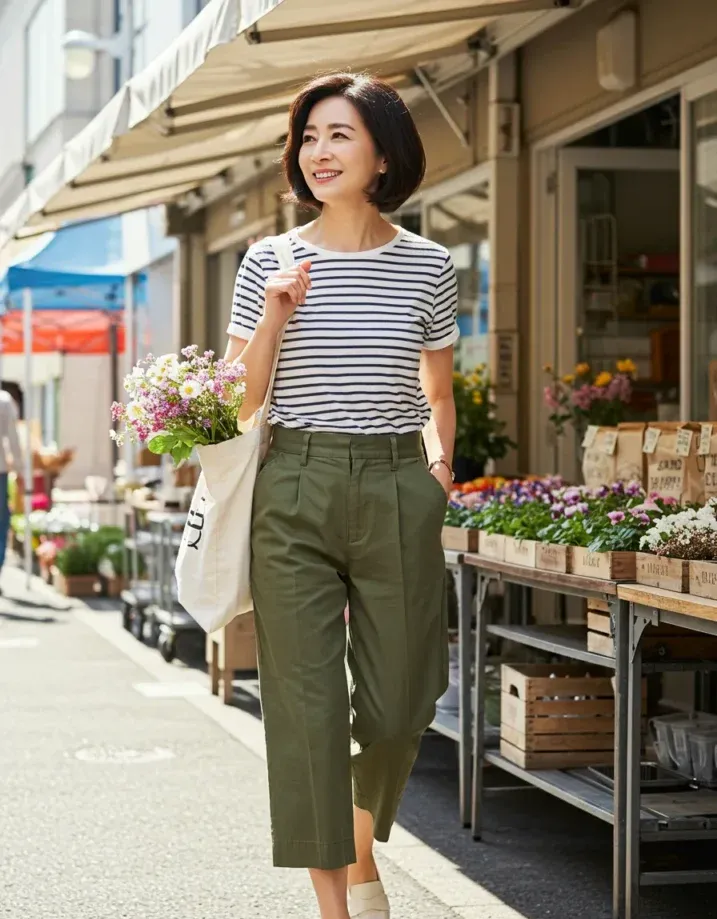 This outfit is a classic mix of comfort and crisp style. The navy-and-white striped tee keeps things casual and nautical, while the olive green cropped trousers give it just the right amount of polish. The high waist and pleated details elevate the whole look, and she s paired it with white loafers for that clean, put-together feel. The tote bag full of flowers? Just the cherry on top of this charming everyday ensemble.