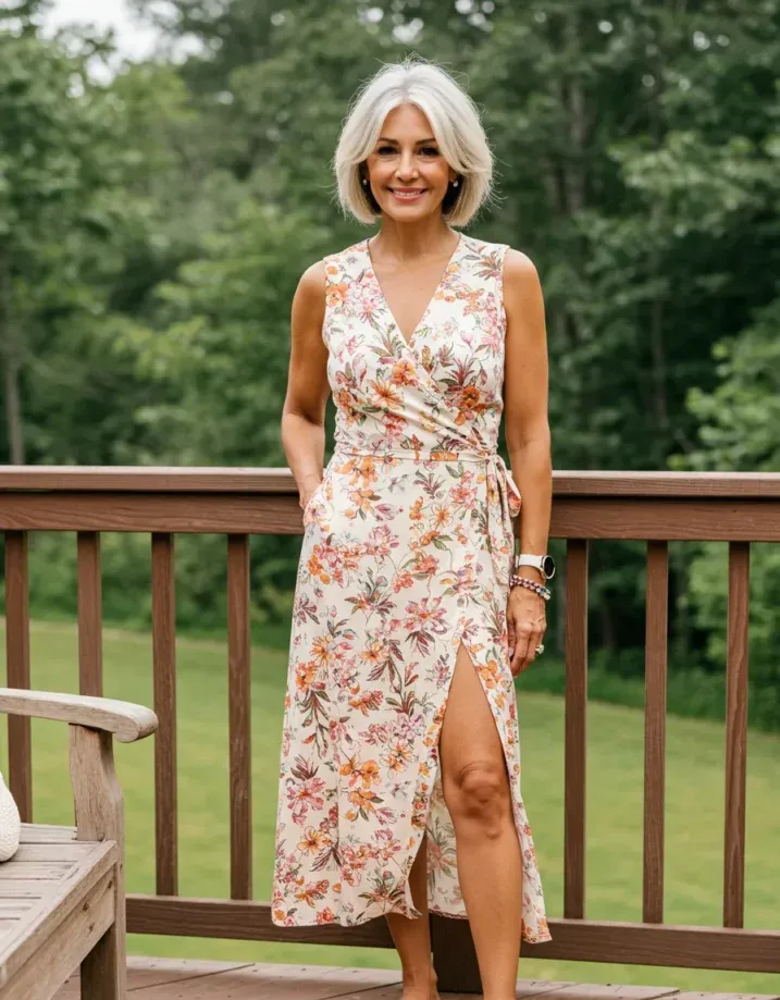 This wrap dress is the definition of pretty and practical. The floral print features warm shades of orange, pink, and green on a soft cream base, and the wrap silhouette is always a win for flattering curves. It cinches gently at the waist with a side tie and flows into a midi length with a subtle slit that adds just the right hint of sass. She s paired it with neutral slide sandals and simple jewelry, letting the dress do all the talking.