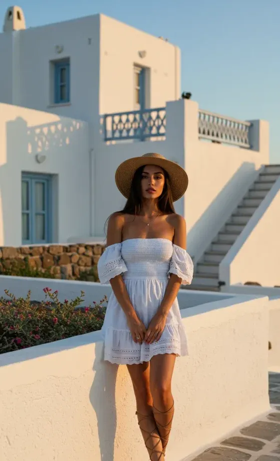 This boho-inspired outfit is the epitome of effortless summer style. The off-shoulder white dress features a smocked top and flowy sleeves, adding a relaxed and feminine vibe. The lace detailing at the hem elevates the charm of the dress, making it perfect for a stroll by the beach or a summer garden party. Paired with this dress are stunning gladiator sandals that wrap around the legs, giving the outfit a bit of edge and structure. A straw hat completes the look, offering both sun protection and a chic finish.