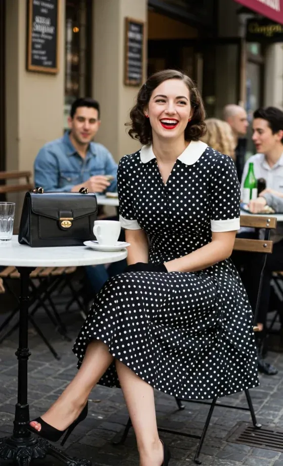 This outfit is a total throwback with a chic modern twist! The classic black and white polka dot dress brings all the vintage vibes with its flattering A-line cut and short sleeves. The white collar adds an extra touch of retro flair, making it feel like you ve just stepped out of an old-school movie. Paired with black peep-toe heels and a sleek black handbag, this outfit feels both playful and elegant, perfect for a café date or an afternoon out in the city.
