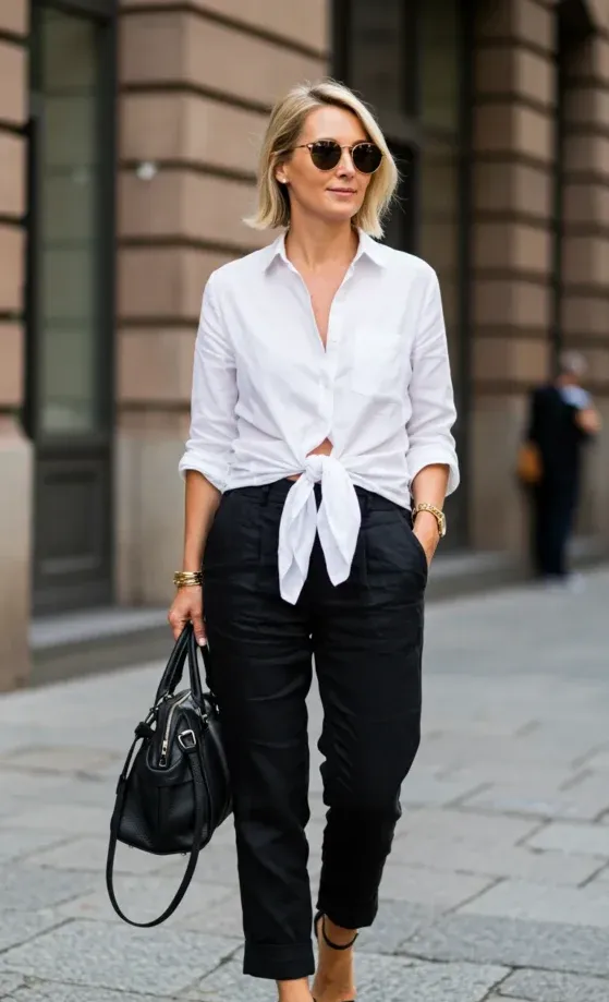 I can t get enough of how this outfit is such a great balance of comfort and sophistication. The knot adds a trendy touch to a classic shirt, and the black shorts are flattering while keeping it casual. It s simple, yet the little details like the knotted shirt and the structured bag make it feel intentional and stylish. It s definitely a look that s easy to recreate and one I d reach for on any warm summer day when I want to look chic without overthinking it.